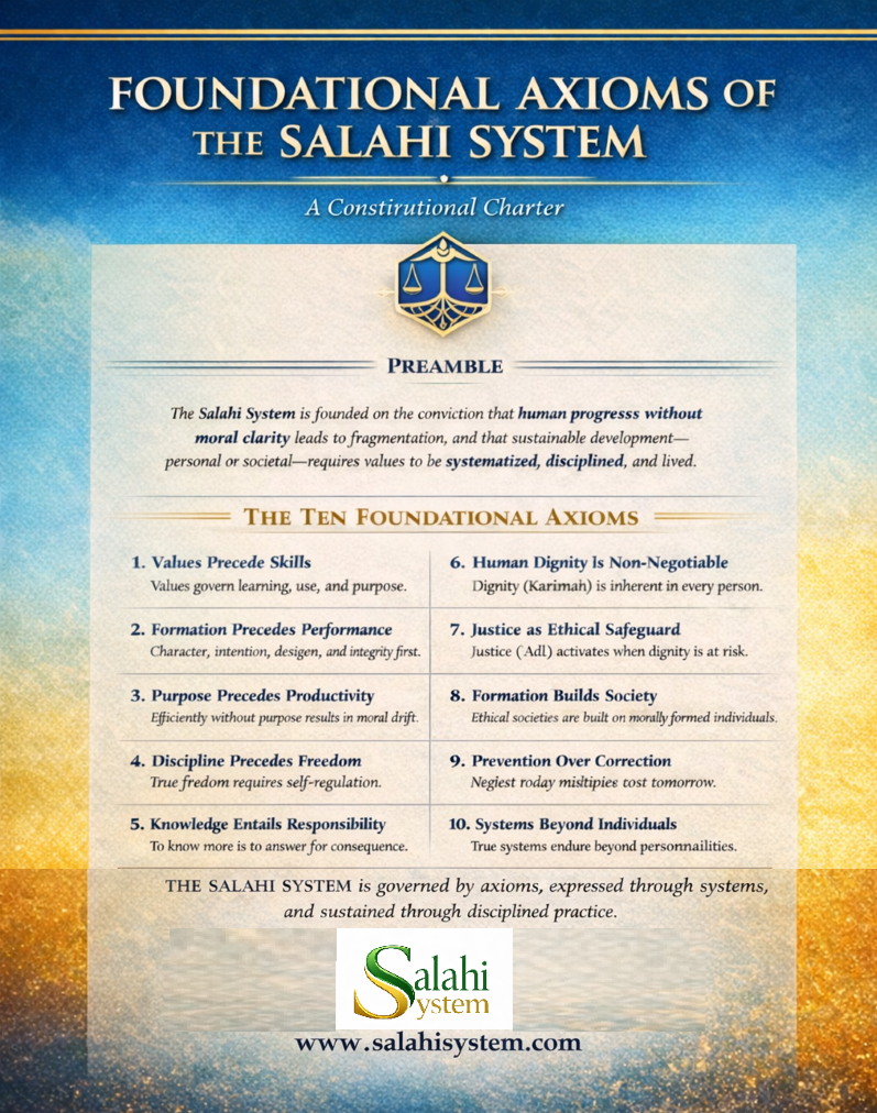 The Salahi System organizes values into disciplined frameworks, ensuring that ethics move beyond abstraction and become habits, decisions, and systems that shape real life.